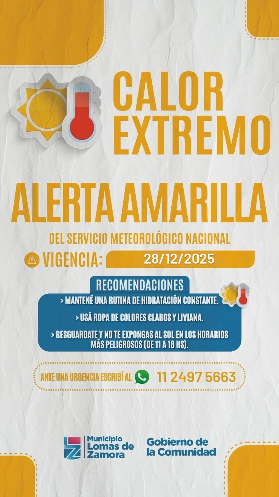 Ante síntomas como mareos, dolor de cabeza, náuseas, respiración agitada, irritación en la piel, deshidratación o desmayos, el Municipio recordó que está disponible el canal de atención vía WhatsApp al 11 2497 5663, donde profesionales de la salud brindan asistencia y orientación inmediata.