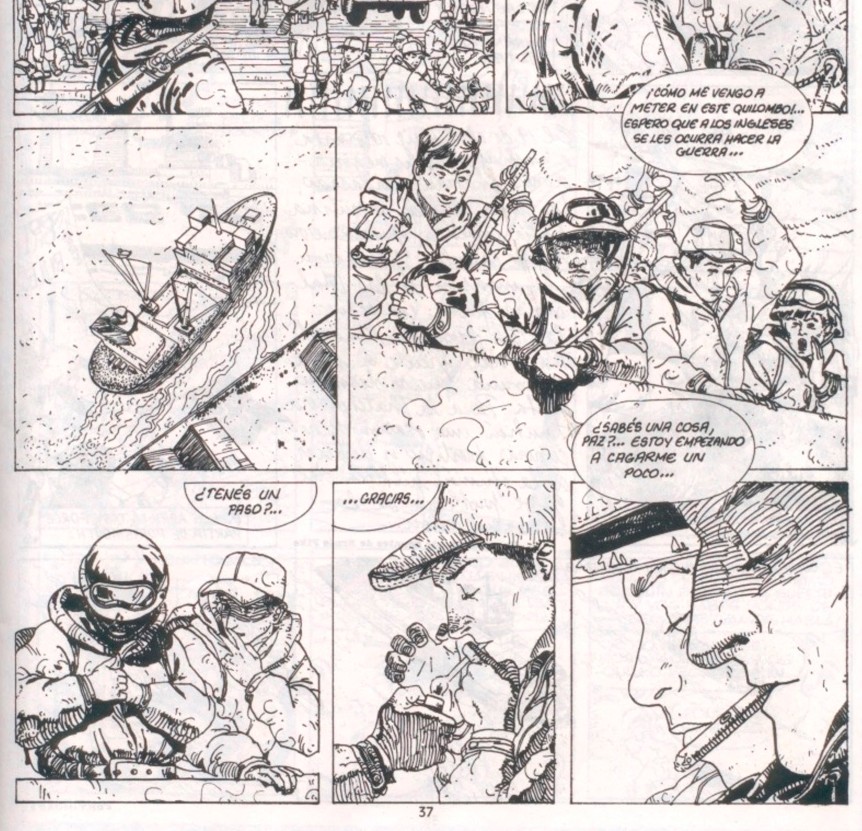 Sin embargo, sería con el regreso de la democracia cuando la historieta se permitiría una reflexión más profunda y compleja. En septiembre de 1984, bajo la dirección de Andrés Cascioli y la jefatura de redacción de Juan Sasturain, apareció Fierro, autodefinida como una “historieta para sobrevivientes”. Fue allí donde nació la serie La batalla de las Malvinas, un proyecto que buscaba explícitamente recuperar la tradición de Oesterheld. Ricardo Barreiro, en los guiones, rindió homenaje al maestro desaparecido incluyendo al propio Ernie Pike como el corresponsal extranjero que cubría el conflicto. En el primer episodio, titulado “Primera sangre” (1984) y dibujado por Alberto Macagno y Marcelo Pérez, se cruza el dato histórico con la ficción política: uno de los protagonistas, el conscripto Rodolfo Paz, es retratado manifestándose en Plaza de Mayo contra la dictadura apenas días antes de ser enviado a combatir a las islas.