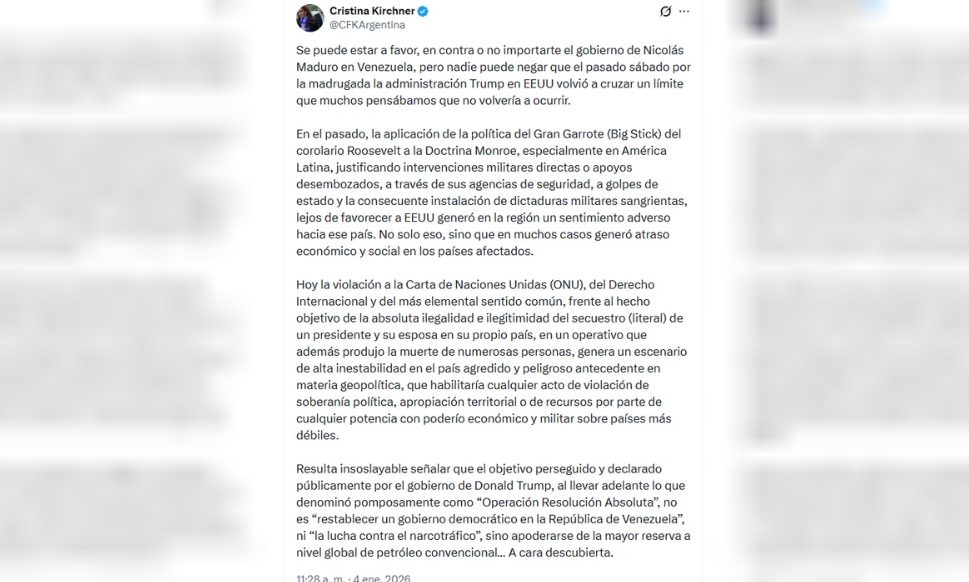 En su pronunciamiento, Cristina Kirchner sostuvo que el operativo militar recordó a la histórica política del “Gran Garrote”, una doctrina de intervención directa aplicada por Washington en América Latina. Según planteó, ese tipo de acciones dejó como saldo décadas de atraso económico, dependencia y desigualdad en la región, bajo el pretexto de garantizar el orden y la seguridad hemisférica.